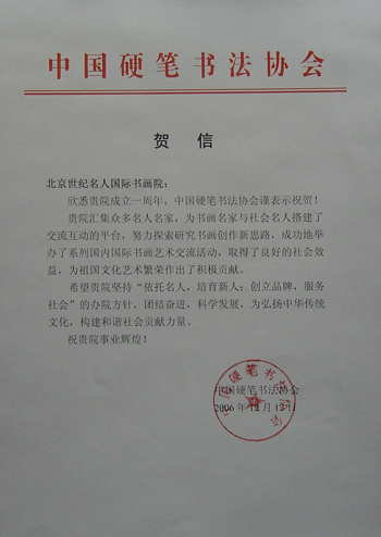 2006年12月24日,中国硬笔书法协会专门为北京世纪名人国际书画院周年院庆发来贺信。