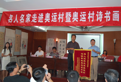 在活动仪式上,北京世纪名人国际书画院秘书长汪碧刚致辞,他说,名人名家走进奥运村,深入生活,参观学习,创作交流,这是积极响应“迎奥运、讲文明、树新风,我参与、我奉献、我快乐”号召的一次具体行动,他表示世纪名人国际书画院秉承“依托名人,培育新人;服务社会,创立品牌”的办院方针,今后将组织更多的名人名家深入基层,服务社会。康成元副院长代表北京世纪名人国际书画院接受了北京奥运村地区党工委书记胡良森赠送的一面印有“名人名家走进奥运村,书画奉献奥运促和谐”的锦旗。北京世纪名人国际书画院院士赵勇代表书画院还向奥运村地区办事处赠送了书法作品。