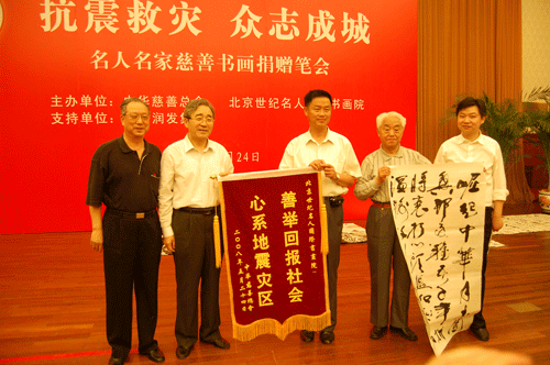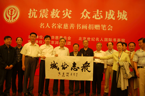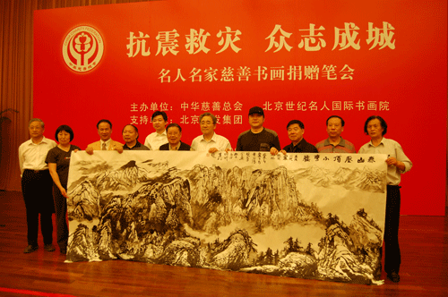 地震无情,大爱无边。2008年5月24日,中华慈善总会、北京世纪名人国际书画院在全国政协礼堂联合主办“抗震救灾 众志成城”名人名家慈善书画捐赠笔会。中华慈善总会会长范宝俊,全国政协原副秘书长、本院院长张道诚分别致辞。范宝俊说,截止到当天,中华慈善总会共收到社会各界慈善捐款近9亿元人民币,社会募捐还在继续进行之中。张道诚号召全院上下齐心协力,把思想和行动凝聚到抗震救灾工作上来,积极捐赠作品,为灾区尽快恢复生产,重建家园奉献爱心。