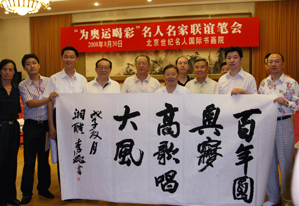2008年8月30日上午 ,值北京奥运会胜利闭幕和北京残奥会即将举办之际,北京世纪名人国际书画院在全国政协礼堂举办了以“为奥运喝彩”为主题的名人名家联谊笔会。十届全国人大常委 周坤仁上将 ,中国文联原党组副书记、副主席高运甲等 本院顾问,中国书协顾问、本院艺术顾问 李铎,全国政协委员、本院艺术顾问陈醉,本院副 院长张飙、梁东、苗培红、朱守道、赵立凡,著名书画家贾起家、王世征、陈培伦、张铜彦、汪国真、米南阳及首都各界知名人士 100 余人出席活动。本院秘书长汪碧刚主持联谊笔会。