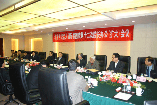 2009年4月19日,北京世纪名人国际书画院在北京亦庄锦江富园大酒店召开第12次院长办公(扩大)会议,全国政协原副秘书长、本院院长张道诚主持会议。商务部原副部长、本院顾问周可仁,中国书协第三届理事、本院副院长梁东,中国书协理事、本院副院长苗培红、朱守道,中国书协发展委员会委员、中国金融书法家协会主席张铜彦,中国书协会员、本院秘书长汪碧刚,本院副秘书长赵勇、张维忠、牛朝、崔勇波、张筱曼,院士彭一超、吴正前、陈培伦、衣惠春、李小成,办公室主任刘欧祥,以及中国美协会员王巨亭、孙德才等参加了会议。