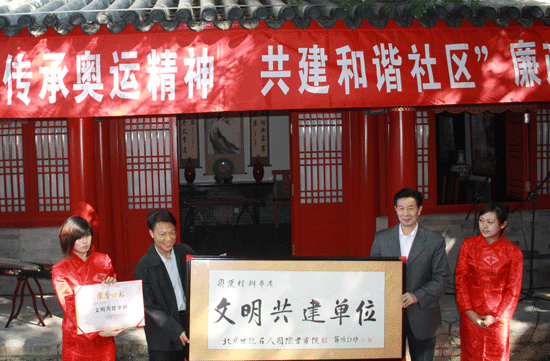 仪式上,名人书画院和奥运村地区互赠了“文明共建单位”牌匾和证书。随后举行了“传承奥运精神,共建和谐社区”廉政书法笔会,名人书画院副院长、著名书法家 苗培红开笔后发表了即席讲话,他指出,坐落在奥运村地区的名人书画院是奥运村地区工委、办事处的文明共建单位,北京奥运会之前举行了“名人名家走进奥运村”、“名人名家走进奥运村绿色家园社区”活动。在之后的今天,我们第三次组织书画家走进奥运村,可以说与奥运村地区结下了深厚的友谊。奥运村地区工委、办事处非常重视精神文明建设和文化工作,作为共建单位,今后我们将 进一步加强双方的交流与互动,深入开展文明共建实践活动,不断探索新路子,总结好的经验做法,为推进奥运村地区和谐社区文明创建活动作出新的贡献。