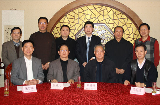 本院院长张道诚(右二),副院长康成元 (左二)、苗培红(右一)、朱守道(左一)、副院长兼秘书长汪碧刚(后排右三)出席会议并同工作人员合影。