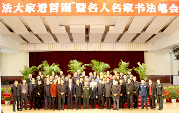 图为“书法大家进首钢”活动的书法大家、名家与首钢集团领导、工人合影。