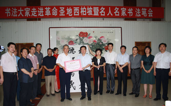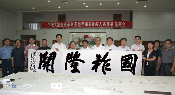 河北省委常委、宣传部部长艾文礼,全国政协原副秘书长、中华慈善总会副会长、名人书画院院长张道诚,西柏坡纪念馆馆长王荣丽分别致辞,对李铎先生心系革命老区、心系基层群众,冒着酷暑率领书法名家送文化到革命圣地,以自己实际行动贯彻党的十七届六中全会精神,落实中央“走基层、转作风、改文风”号召,精神可嘉,值得学习,表示钦佩和敬意。中国书法家协会理事、名人书画院副院长朱守道、张铜彦,中国书法家协会理事张坤山,全国青联委员、中国书法家协会青少年工委委员、名人书画院副院长兼秘书长汪碧刚,中国书法家协会会员、名人书画院副秘书长张维忠、崔勇波、李小成,名人书画院院士边保华 等书法名家参加笔会,河北省委宣传部副部长武鸿儒、 省驻京办副主任周金平,石家庄市委常委、宣传部部长孙万勇,以及西柏坡纪念馆干部职工100余人参加活动。河北省驻京办主任高建民主持活动。