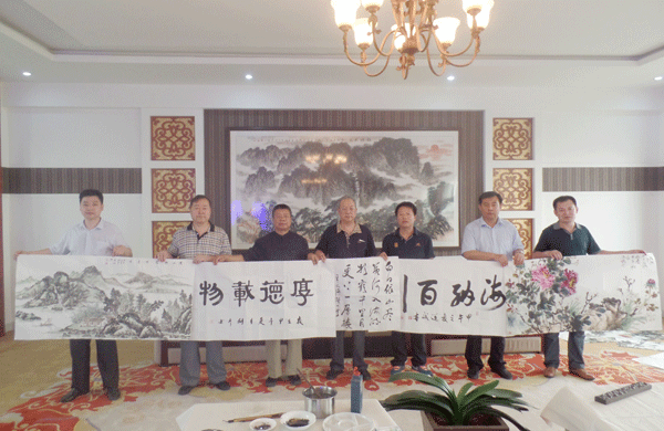 2014年6月3日 ,本院书画家在 广饶县大王镇的山东乐悠悠花生油科技有限公司举行笔会。张道诚(左四) 、张铜彦(左三)、汪碧刚(左一)、陈培伦(左二)、薛居波 ( 右一 ) 与该公司董事长尤学永 ( 右三 ) 、总经理李永吉 ( 右二 ) 现场展示部分作品。