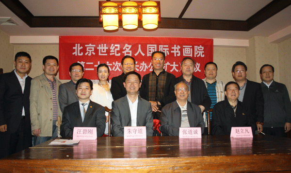 2014年10月16日下午,北京世纪名人国际书画院在京召开第二十六次院长办公(扩大)会议,全国政协原副秘书长、名人书画院院长张道诚,中国书协理事、名人书画院副院长朱守道,央视国际画院院长、名人书画院副院长赵立凡,全国青联委员、中国书协青少年委员会委员、名人书画院副院长兼秘书长汪碧刚,名人书画院副秘书长崔勇波、牛朝、张筱曼、彭一超、李小成、王巨亭、钱建恒,名人书画院中国画创作委员会秘书长陈培伦、委员薛居波等参加会议。