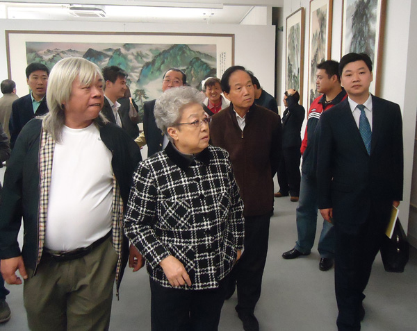 图为吴仪(左二)、贾春旺(右二)、汪碧刚(右一)等在画家米文杰(左一)的陪同下参观展览。