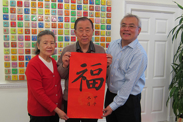 万福送万家,世界共享中国年。联合国秘书长潘基文先生(中)写福字、送祝福,联合国秘书长潘基文专门为中央电视台春节联欢晚会题写了主题“家和万事兴”,为网络春晚题写“福”字(上图),并用中文祝福中国人民:“亲爱的中国朋友们,新春快乐!”