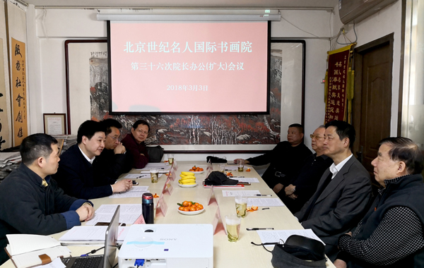 2018年3月3日,北京世纪名人国际书画院在京召开第36次院长办公(扩大)会议,研究部署了近期工作。全国政协原副秘书长、名人书画院院长张道诚,中国书协第六届理事、中央国家机关书协副主席、名人书画院副院长朱守道,中国书协第四届理事、中央电视台原副总编、名人书画院副院长赵立凡,中国书协第六届理事、中国金融书协名誉主席、名人书画院副院长张铜彦,全国青联委员、中国书协第六届青少年工作委员会委员、名人书画院副院长兼秘书长汪碧刚,书画家、名人书画院副秘书长彭一超、李小成、王巨亭,名人书画院办公室主任刘欧祥等参加会议。