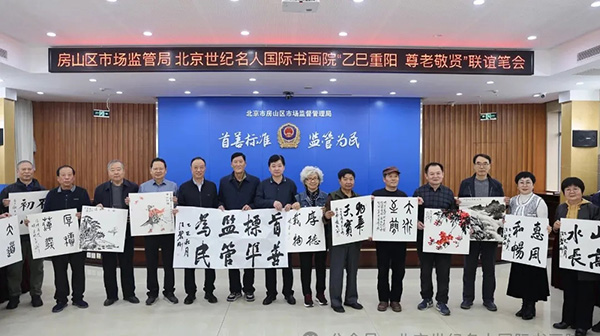 10月29日是2025年重阳节,北京世纪名人国际书画院组织首都书画家一行10人走进北京市房山区市场监督管理局,与该局联袂举办“乙巳重阳·尊老敬贤”书画联谊笔会,弘扬“尊老、敬老、爱老”的传统美德,以文化艺术传递节日温情,践行文化惠民初心,受到该局全体干群和退休老同志的欢迎。