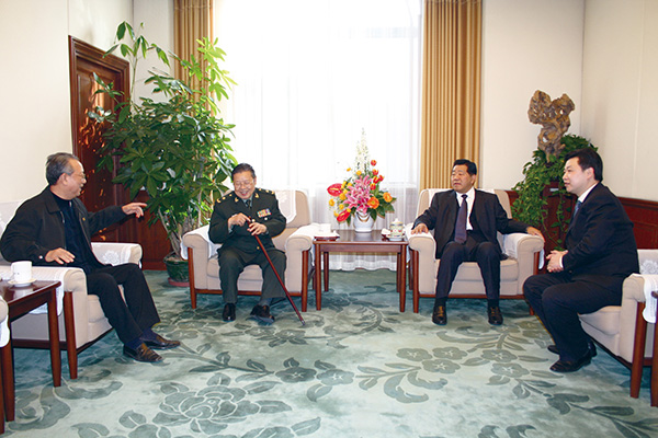 2010年3月10日,中共中央政治局常委、全国政协主席贾庆林(右二)亲切接见北京世纪名人国际书画院艺术顾问李铎(左二)、院长张道诚(左一)、秘书长汪碧刚(右一)并作重要指示。